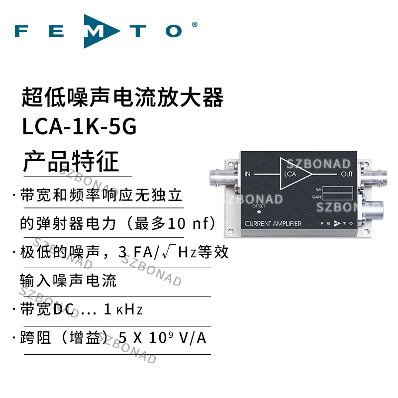 LCA-1K-5G是德国FEMTO公司生产的超低噪声跨阻放大器,适用于高精度电流信号检测场景。