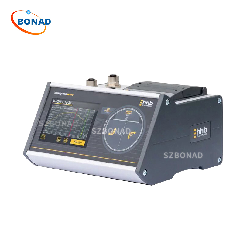 在带有非接触式保护装置的危险机器上进行。光幕、区域扫描仪以及双手控制装置可以无障碍地进入机器的危险区域。然而,只有当保护装置和危险点之间的安全距离足够大时,它们才能保证保护。在机器停止之前不得到达危险点。使用测量的停止时间和 EN/ISO 标准中的公式计算必要的安全距离。 Safetyman DT2 测量系统主要由测量装置、位移传感器和执行器组成。测量过程中,传感器记录机器的运动,执行器通过保护装置直接触发机器停止。测量直至停止的后续时间,正确的安全性