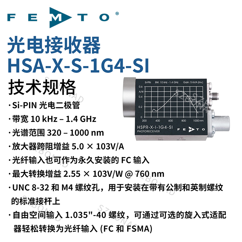 通过运用经证实的显著的FEMTO GHZ放大器技术,我们设计了一款新的具有卓越性能的先进的光接收器。HSA-X-S提供了高带宽限制在2GHz ,使用硅或铟镓砷二极管两种模型,光谱范围分别在320-1000nm和900-1700nm。因为这个放大器的噪声等效功率最小值只有14 pW/√Hz,互助抗值在5×103V/W。所以这个仪器可以在μW范围内用GHz 的速度测量光功率。