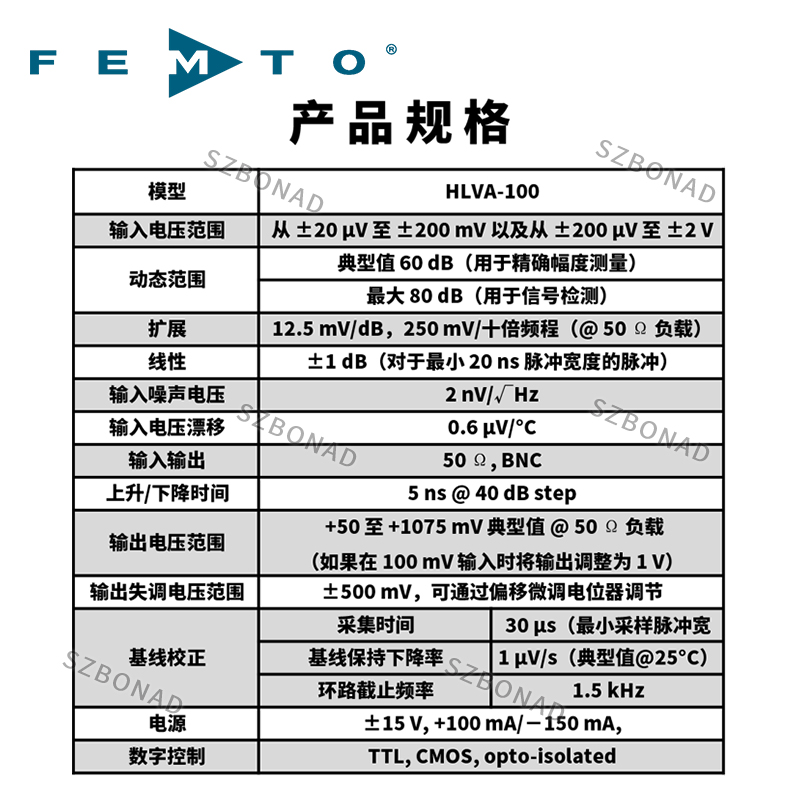 FEMTO HLVA-100提供了一个达80dB的宽动态范围。在直流耦合输入和只有5ns的上升时间的基础上,HLVA-100是测量快速和高动态脉冲的理想工具。它的输入电压噪声非常低,只有2 nV/√Hz。这个对数增益曲线具对小输入信号和有高的增益量,对高输入信号具有相应低的增益量。因此HLVA-100 是高动态范围和人们所期望的信号压缩应用的理想放大器。